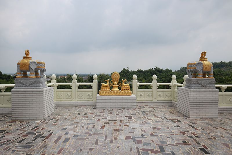 佛寺正面中央為紅色的花崗岩牆面象徵蓮花部慈悲智慧與懷愛,三樓白色外牆象徵著大日如來佛光普照十方法界,四個轉角面為極高雅的墨綠色黃山石石英磚象徵事業竭摩部北方不空成就佛的綠色光。