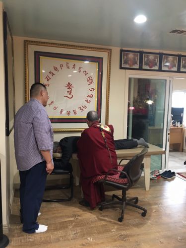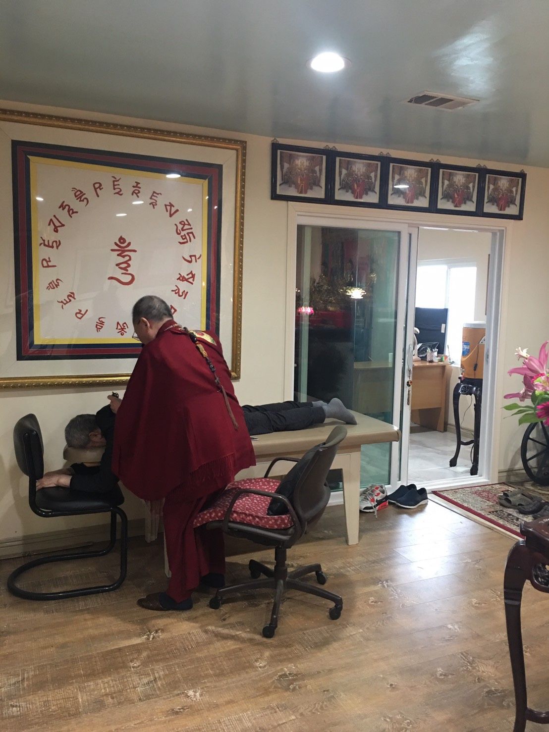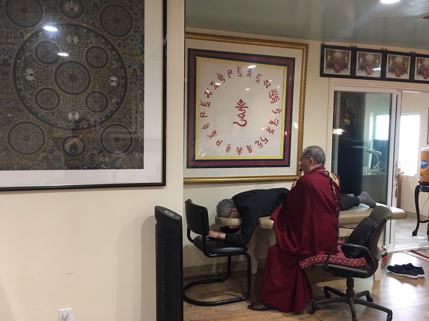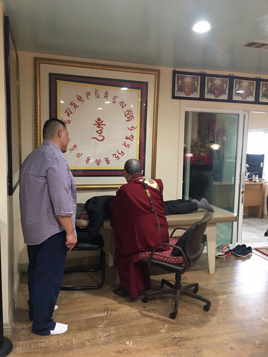 法王為陳先生加持腰椎以去除他跌倒撞擊的傷害