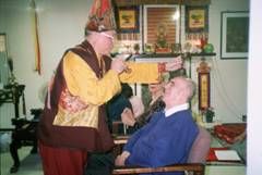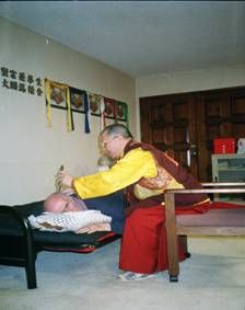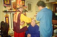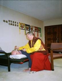 | 法王先為梅爾芬先生加持灌頂,使他有體力的安住在座,全程參加約翰先生的除障法會,承受佛菩薩的加被。 |  |