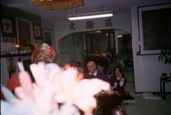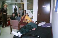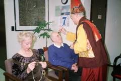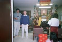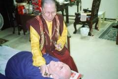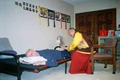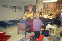 約翰先生法會圓滿後,梅爾芬夫人很虔誠的懇求法王幫助,法王答應盡全力為他加持靈療除障,斯時梅爾芬夫人流下眼淚,非常感動的跪下,滿懷無限的希望,感謝法王的慈悲。法王開始為他靈療消災。 | 法王為了完成對他的承諾,不斷對梅爾芬先生作各種加持與灌頂,在場弟子都很驚奇的凝視觀看與期待。 | 法王答應梅爾芬夫人,於丈夫第二次消災除障後,就能起步走路。看!第二次加持後,老人家終於自己坐起來了! |