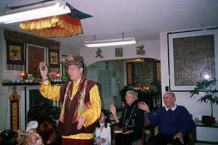 法王不斷以「蓮華生大士憤怒八變尊」真言密咒的能量加持,去除他身上的動物靈,讓他神智恢復清醒,使老人癡呆障礙,完全淨化。 | 當法王逼出梅爾芬身上動物靈的無明障礙後,隨之恭請毗盧遮那大日如來佛大轉法輪,將動物靈渡化往中央嚴密的國土。看!梅爾芬夫婦,非常高興揮手告別動物靈,說聲「再見」。 |  |